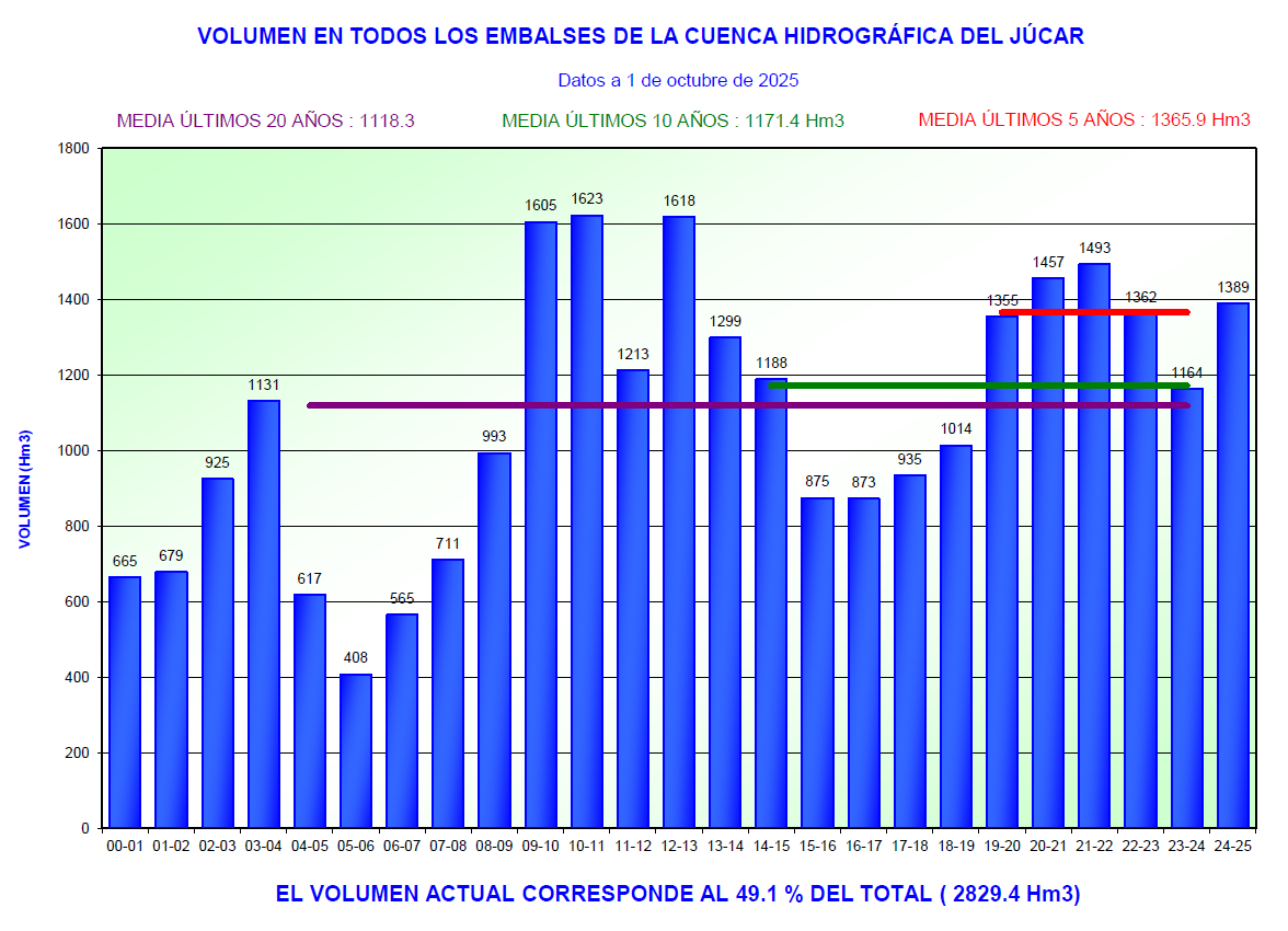 Las precipitaciones han tenido una incidencia directa en el aumento de las reservas de los embalses de la Demarcación, que el pasado 1 de octubre comenzaron el año hidrológico 2025-2026 con 1.392 hm3, lo que supone el 49% de la capacidad total. Este valor es superior al del año pasado en la misma fecha (1.164 hm3) y se sitúa por encima de las medias de los últimos 5, 10 y 20 años.