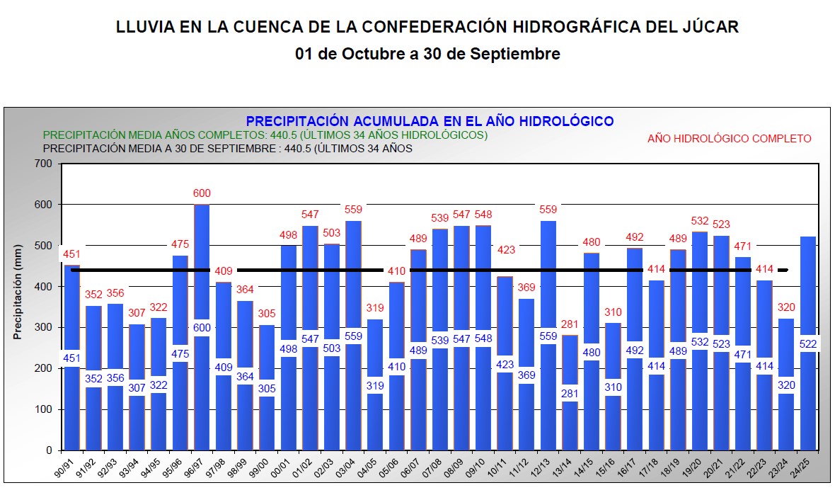 El año hidrológico se ha caracterizado por albergar tres episodios de lluvia muy importantes en la mayor parte del territorio, precipitaciones registradas en los meses de octubre-noviembre y marzo de 2024, y finales de septiembre de este año. Especialmente importantes han sido las lluvias acumuladas en el sistema Cenia-Maestrazgo, que ha cerrado el año hidrológico con la cifra de precipitación media areal más alta desde que se tiene registros en esta zona con 903 mm (el pasado año hidrológico la precipitación fue de 349 mm).