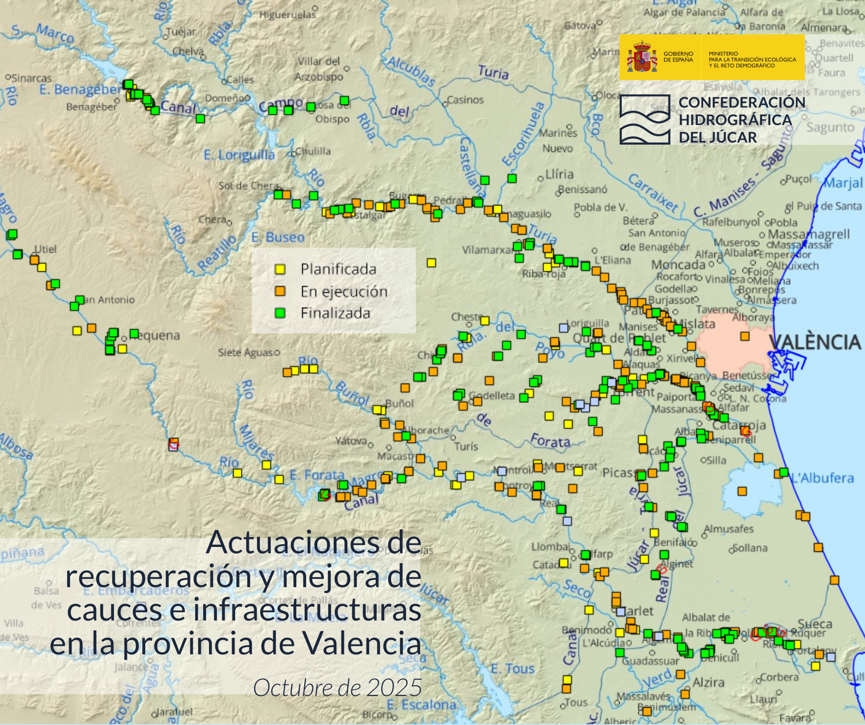 Dentro de este paquete de actuaciones, el Organismo ha priorizado las que permiten garantizar el abastecimiento de agua urbano a toda el área metropolitana de Valencia (el caso del Canal Júcar-Turia) y de Villar del Arzobispo, y de los regantes de más 24.500 hectáreas del Campo de Lliria (Canal Principal Campo del Turia); asimismo, aquellas que aumentan la seguridad de la población ante futuros episodios de grandes avenidas, como la extracción de lodos y reparación de daños en la presa de Forata, la restauración y reconstrucción del barranco del Poyo, o la reparación de daños en los cauces del Magro, del Bajo Júcar y del tramo bajo del río Turia.