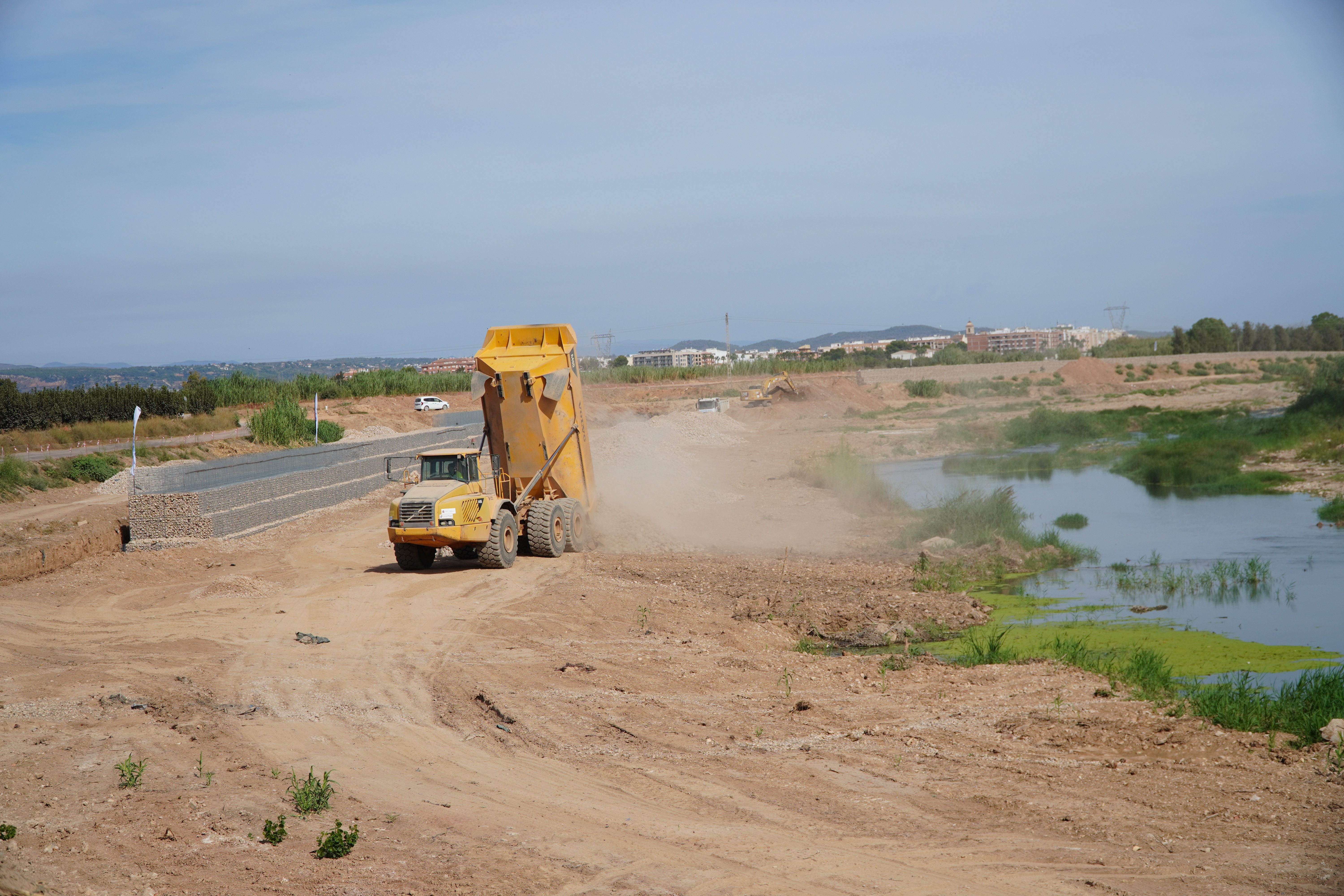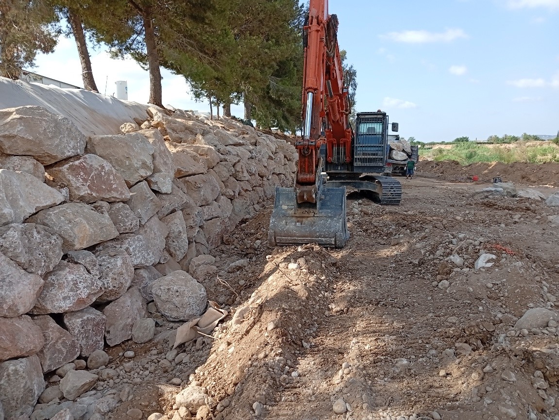 A su paso por Guadassuar, los taludes de la margen derecha del río Magro resultaron seriamente dañados por lo que se está procediendo a su estabilización y refuerzo mediante escollera y colchones Reno.