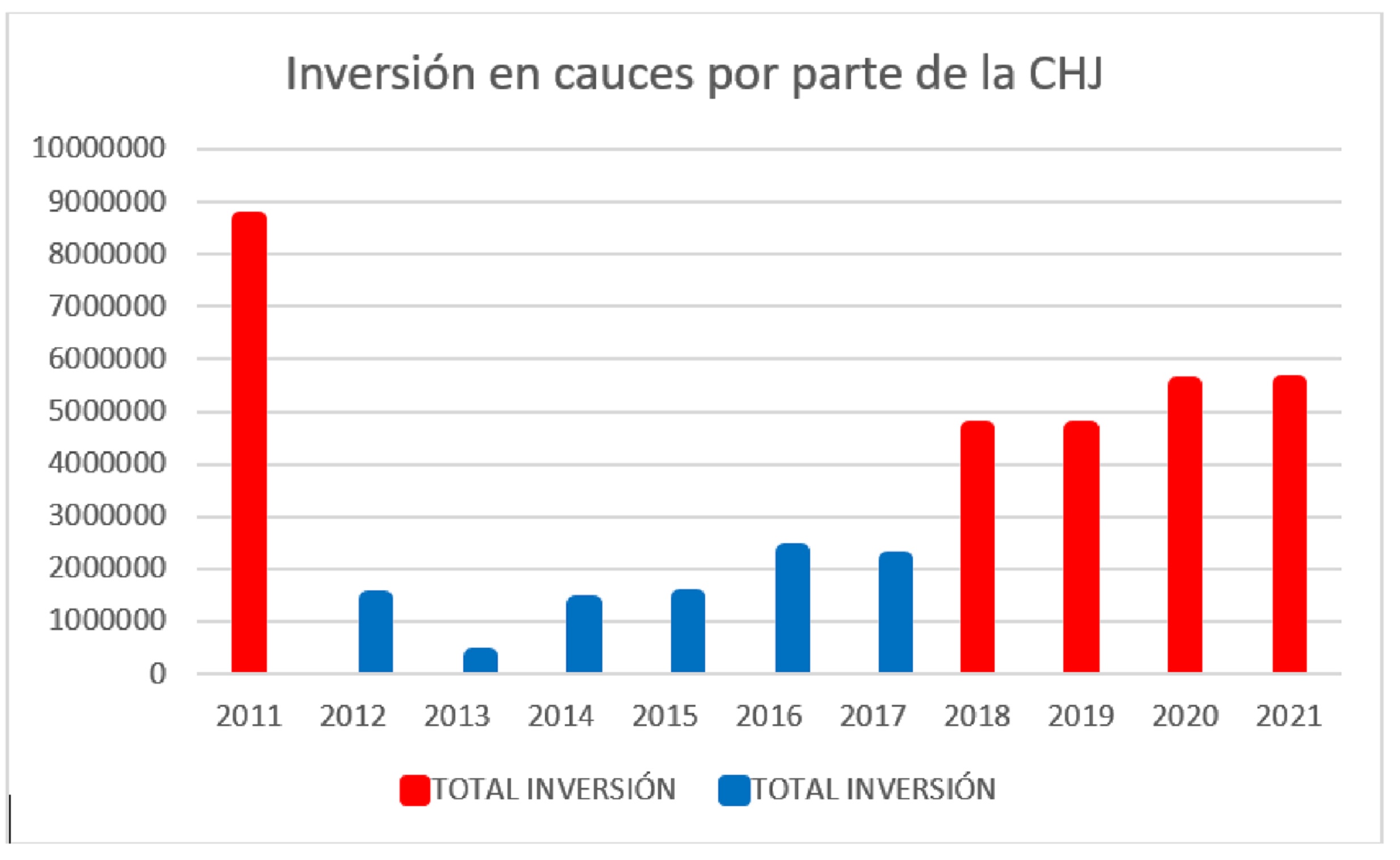 Las inversiones en los últimos años en cauces realizadas por la CHJ son las siguientes: